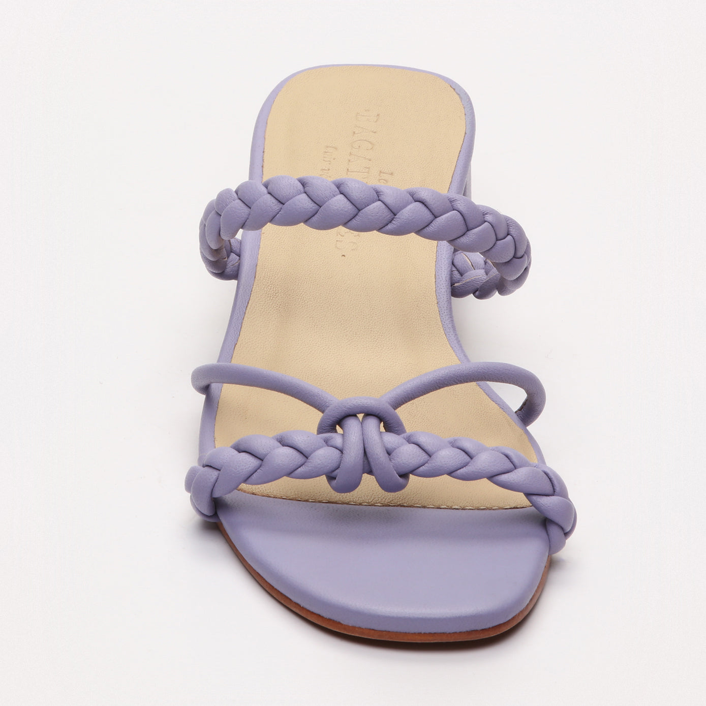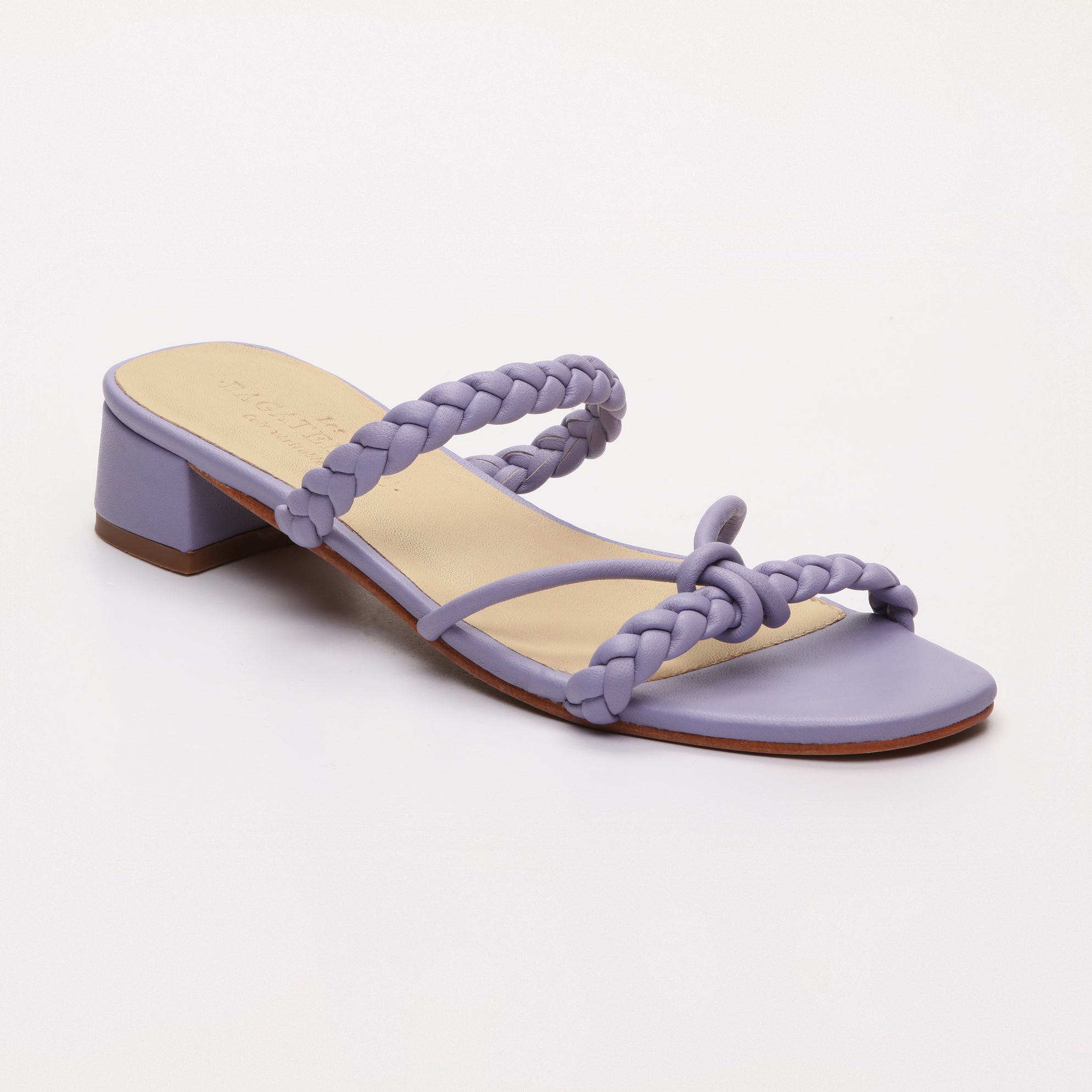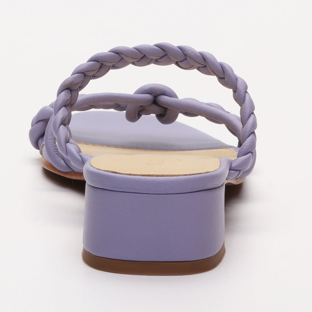 Résolument chic et élégante, la sandale Geraldine surprend par sa couleur lavande uniforme. Son empeigne en cuir nappa est sublimée par des brides tressées qui viennent s'entrecroiser avec une plus fine sur le dessus du pied.